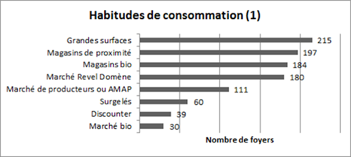 L’enquête révèle que les courses (que ce soient le frais, l’épicerie ou le non alimentaire) sont faites principalement en grandes surfaces (super et hypermarchés), en magasin de proximité, en magasin Bio ou au marché de Revel/Domène. Les autres lieux (surgelés, discounter et marché bio) sont nettement derrière.