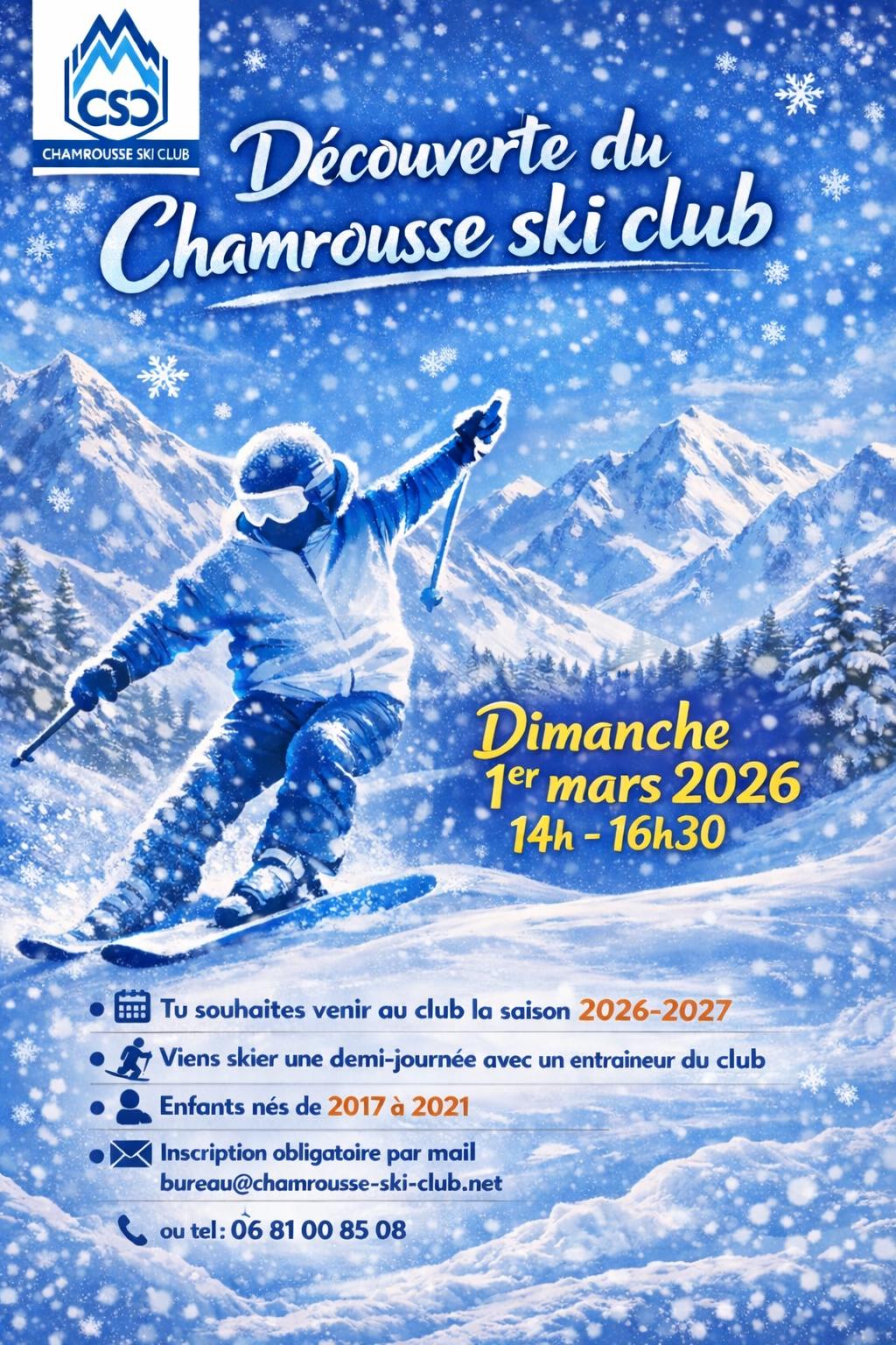 Découverte du club de ski de Chamrousse (CSC), tu souhaites venir au club pour la saison prochaine (hiver 2026-2027), viens skier une demi-journée avec un entraîneur du club le dimanche 25 janvier 2026 de 14h à 16h30 (pour les enfants nés de 2017 à 2021).